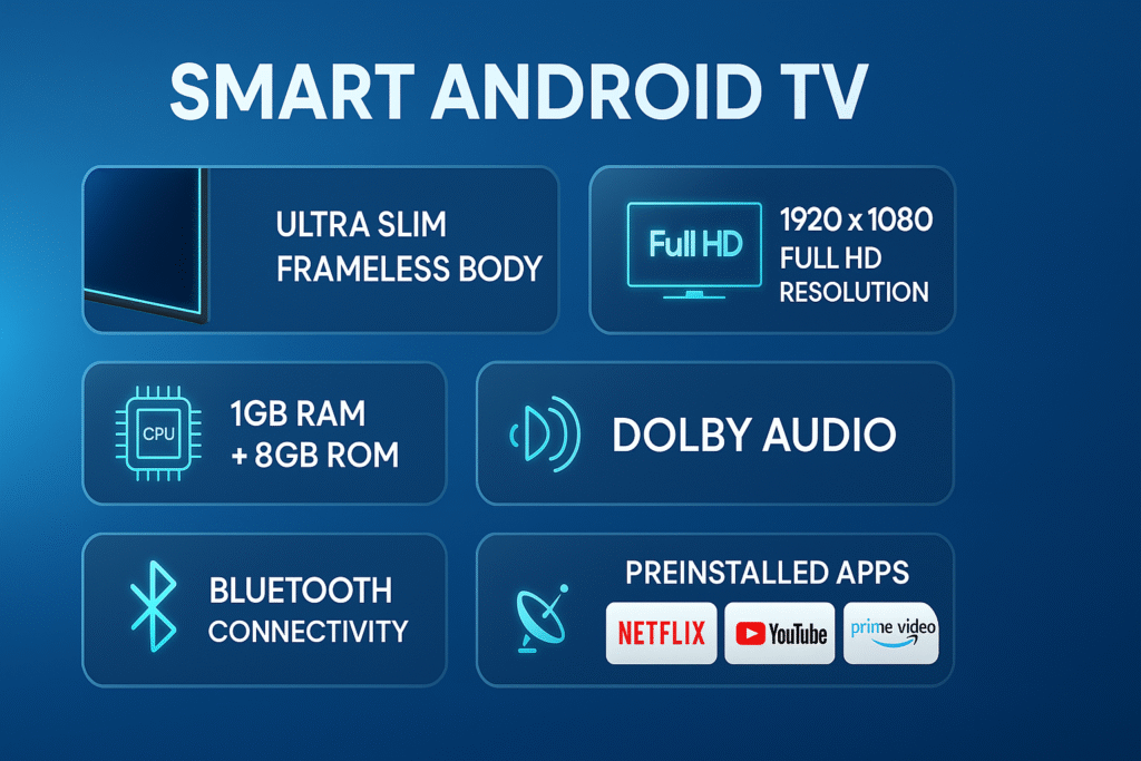 Step into the future of home entertainment with the AILIVA O43A-01, a stunning 43-inch frameless Ultra HD TV that redefines smart living. Featuring a crystal-clear Grade A+ BOE panel, this Android 12-powered TV delivers breathtaking 4K visuals with enhanced performance from its 1GB RAM + 8GB ROM configuration. Enjoy seamless access to all your favorite content through the Google Play Store and premium OTT platforms including Netflix, Amazon Prime, and Disney+ Hotstar.